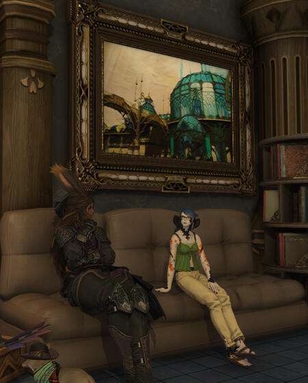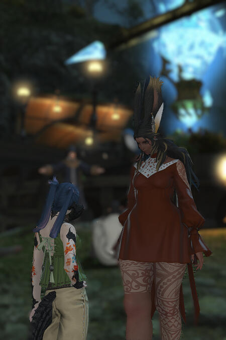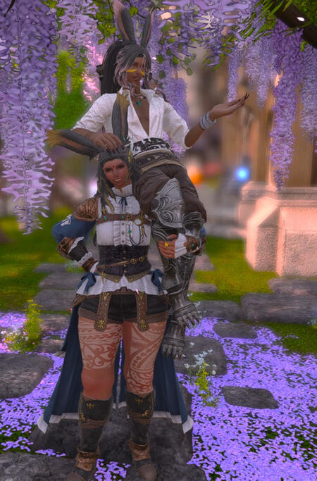 These two first crossed paths at a hunting guild in Gridania, and despite her jokes at his expense, Artemis stuck around & has become her dearest friend. Both hailing for Golmore Jungle, these two travelled halfway across the star before they met, and coudn't have had more opposite experiences. As such, Cyrelle has taken it upon herself to expand Artemis' cultural horizons & encourages him explore his own boundaries, and in the process, Artemis is doing the something similar for Cyrelle.